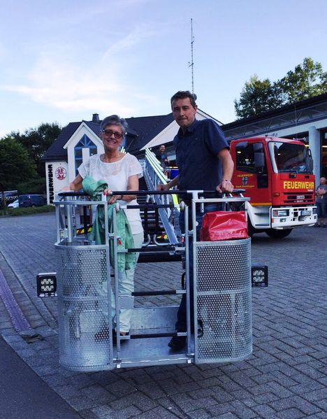 Angelika König und Armin Fahrenkrog Drolshagen. Unzählige Vorstellungstermine absolvierte die SPD-Bürgermeister-kandidatin in den letzten Wochen bereits. Unter anderem besuchte sie die Freiwillige Feuerwehr im Drolshagener Gerätehaus. Direkt zu Beginn ihres Besuches ging es hoch hinaus: Gemeinsam mit Feuerwehr-Chef Armin Fahrenkrog wurde sie mit dem neuen Leiterwagen auf eine Höhe von 30 Meter gefahren. Nicht zuletzt aufgrund des Einsatzes der SPD Fraktion war diese möglicherweise lebensrettende Investition erfolgt.